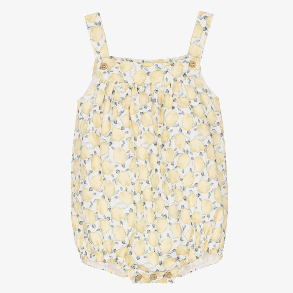 Patterned in a lovely yellow and green turtle print, the classically styled shortie for baby girls and boys is by Mebi. It is made in lightweight cotton and fully lined for comfort. There are traditional wooden button fastenings on the shoulder straps and between the gently elasticated legs.