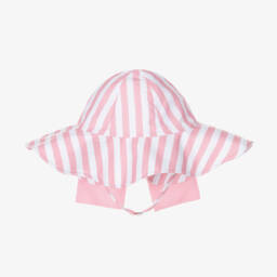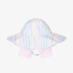 Girls sun hat by Meia Pata, made in soft, lightweight fabric. It features a charming ditsy floral pattern in shades of blue, pink and green. The wide brim provides shade from the sun, and there is an adjustable chin strap for a secure fit. A large pink bow on the back adds a pretty finishing touch.