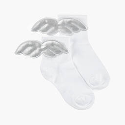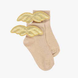 Adorable beige and gold socks for little girls by Meia Pata, beautifully made in soft cotton. Shimmering wings are accented on the back of each heel for an angelic look.