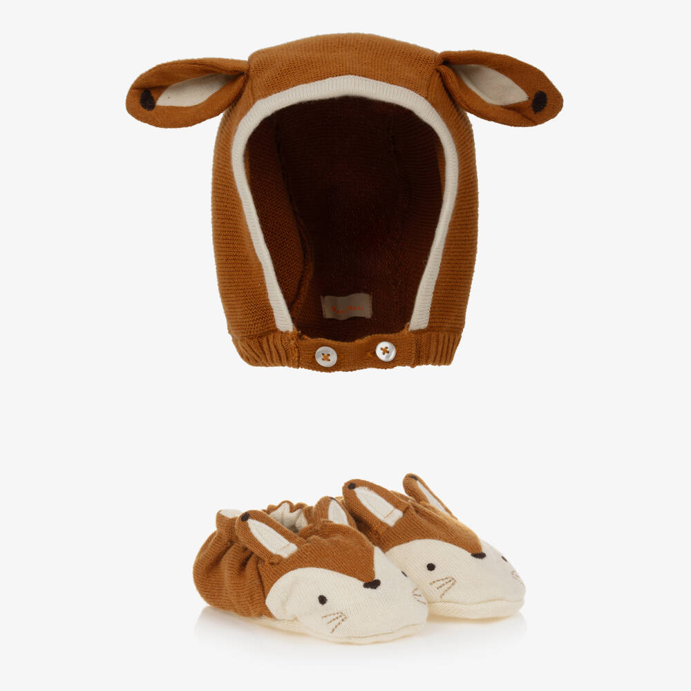 Adorable orange-brown hat set for baby boys and girls by Meri Meri, made in a beautifully soft organic cotton knit. The cosy hat has an ivory trim, cute 3D ears on the top and fastens with buttons under the chin. The booties have matching ears, with a sweet fox face embroidered on the front. They have elasticated cuffs for a comfortable fit on little feet.