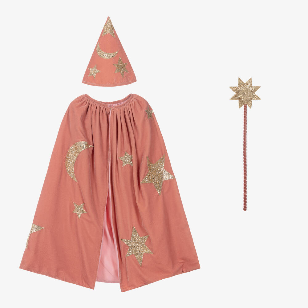 Girls will be magically transformed into a wizard with this fun costume by Meri Meri. The pink cape and pointed hat are made in beautifully soft velvet and decorated with glittery gold stars and moons. Lined in comfortable cotton, the cape fastens at the neck with a popper. The wooden wand is covered in pink velvet ribbon and topped with a glittery gold star.