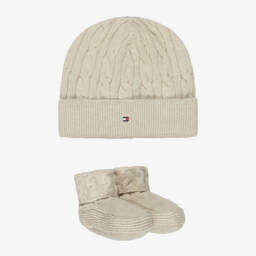 Adorable orange-brown hat set for baby boys and girls by Meri Meri, made in a beautifully soft organic cotton knit. The cosy hat has an ivory trim, cute 3D ears on the top and fastens with buttons under the chin. The booties have matching ears, with a sweet fox face embroidered on the front. They have elasticated cuffs for a comfortable fit on little feet.