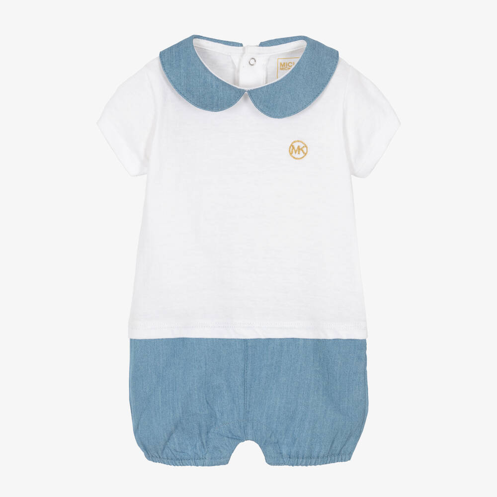 Sweet white and blue shortie for baby girls from Michael Kors, made in soft cotton to be comfortable against delicate skin. Designed to look like a white jersey top and chambray shorts, it has easy-to-use popper fastenings on the back and between the legs for easy dressing. A chambray collar and gold embroidered logo on the chest give a pretty finish.