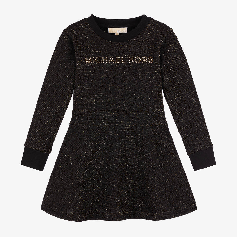 Comfortable and stylish for girls, this black cotton jersey skater dress from Michael Kors Kids is made with shiny gold thread for a subtle sparkly look. An easy-to-wear, slip-on design, it has a ribbed crew neck and cuffs. For an unmistakable designer look, there is a logo print on the front in shiny gold dots.