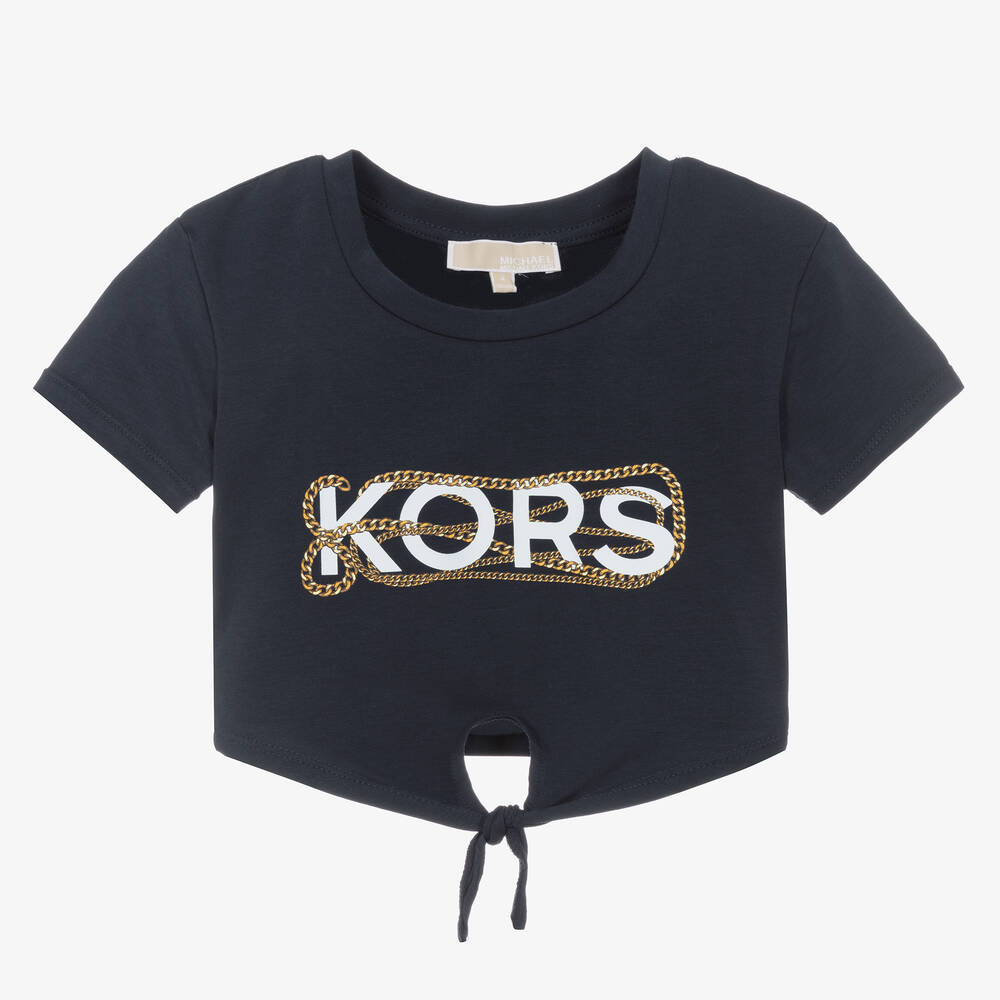A stylish navy blue T-shirt for girls by Michael Kors, made in luxuriously soft cotton jersey. This top features a gold chain logo print on the front for an edgy, glamorous look. In a cool cropped fit, the tie front gives definition and shape to the top.