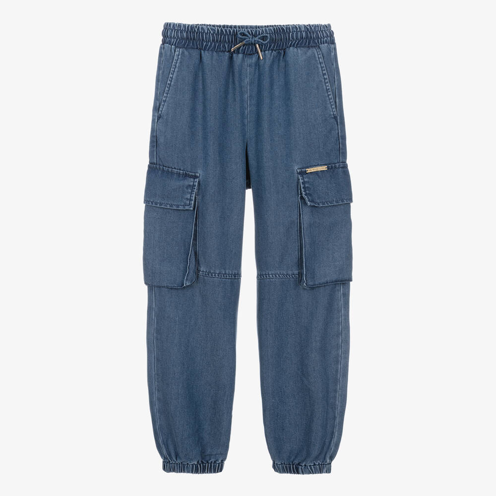 Cool and casual for girls, these Mini-me cargo-style blue jeans are by Michael Kors Kids. Made in lightweight denim, they are elasticated around the ankles and waist, with gold-tone capped drawstring ties to adjust the waist. There are two flap pockets, one trimmed with a gold-tone branded plate for a designer finish, and two slanted front pockets.