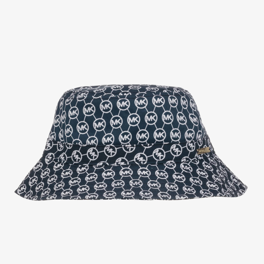 Navy blue cotton twill bucket hat for girls by Michael Kors, with an all-over white MK logo print and a gold logo tab.