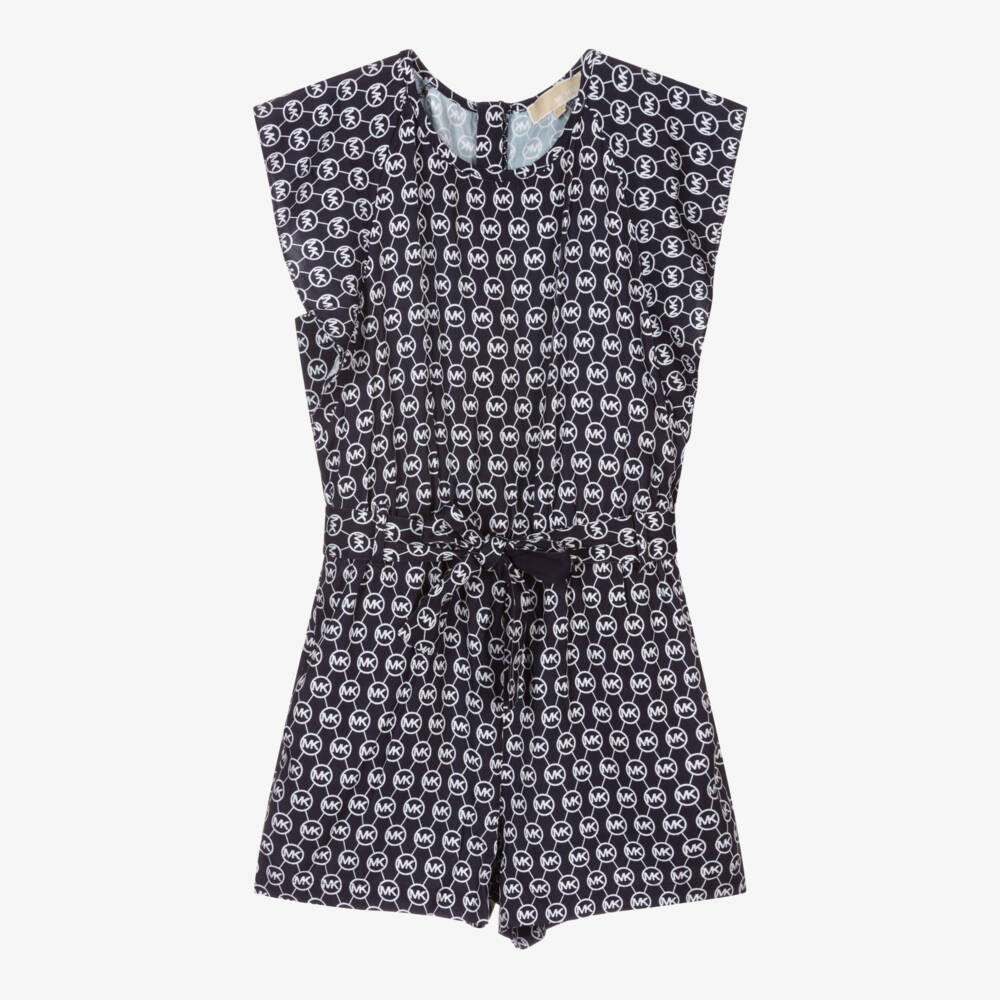 Navy blue playsuit for girls by luxury American designer Michael Kors, with short raglan sleeves. Made in lightweight viscose, it is patterned with the brand's repeat MK logo in contrasting white. It has a matching removable sash which is navy blue on one side with a white logo. There are useful concealed pockets in the side seams.
