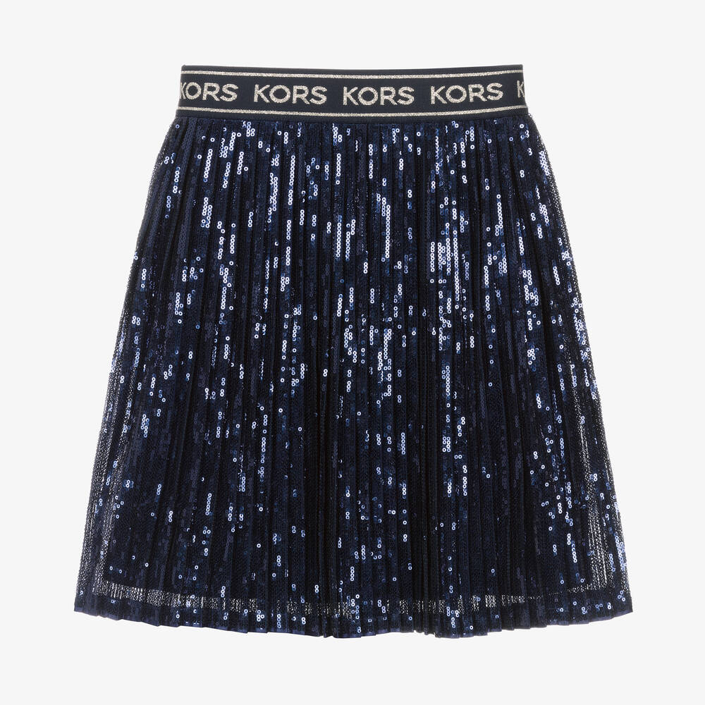 Eye-catching pleated navy blue skirt for girls by American brand Michael Kors Kids. Made in lightweight tulle embellished with shimmering sequins, it has a comfortable, elasticated waistband with glittery gold, repeat, jacquard logos all around. The skirt is lined in soft viscose and is easy to wear, simply pulling up.