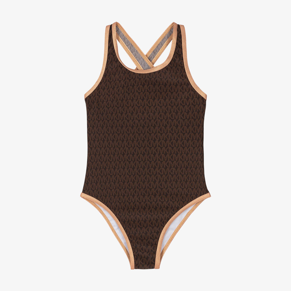 Brown and gold trim swimsuit for girls by luxury American designer Michael Kors, with an all-over contrast logo pattern. Silky, stretchy and fully lined for comfort, this classic style has cross-over shoulder straps.