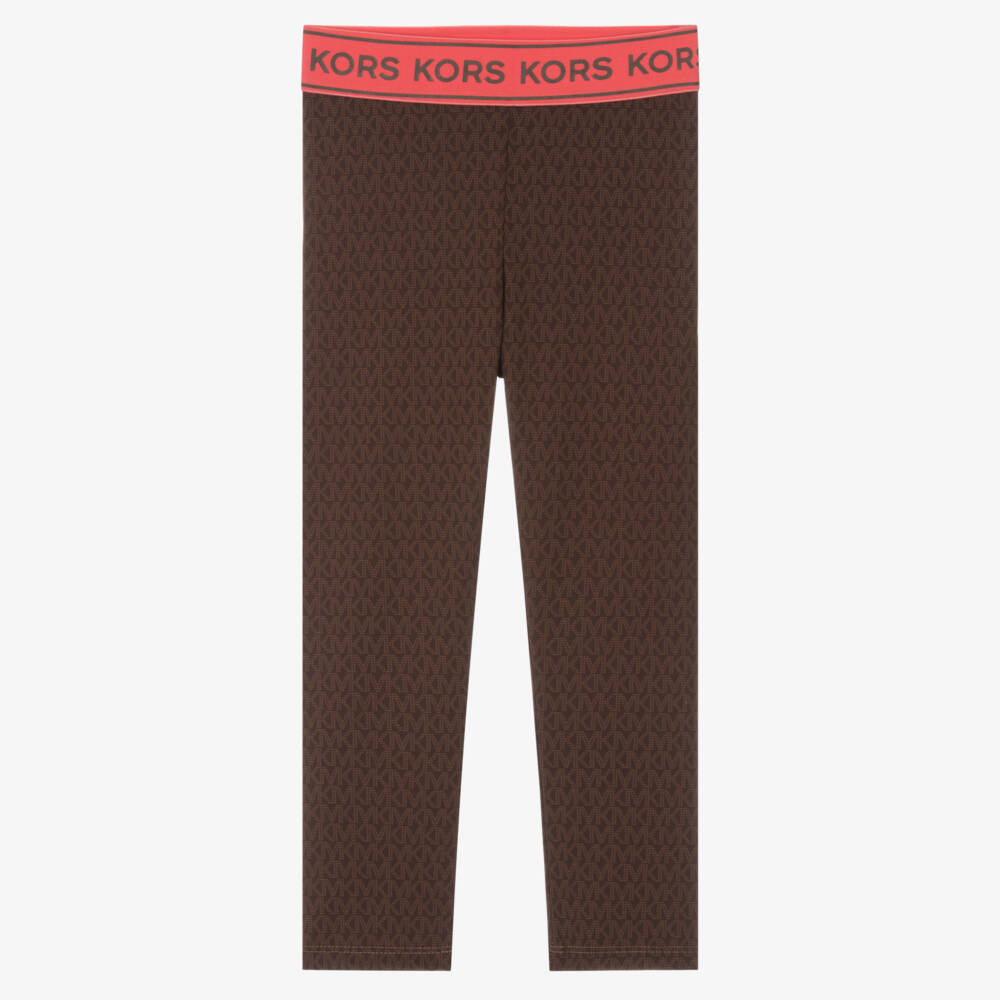 Mini-me brown leggings for girls by American designer Michael Kors Kids. Silky and stretchy, they are patterned with a tone-on-tone beige monogram pattern. They have a coral pink elasticated waistband with brown logo prints.