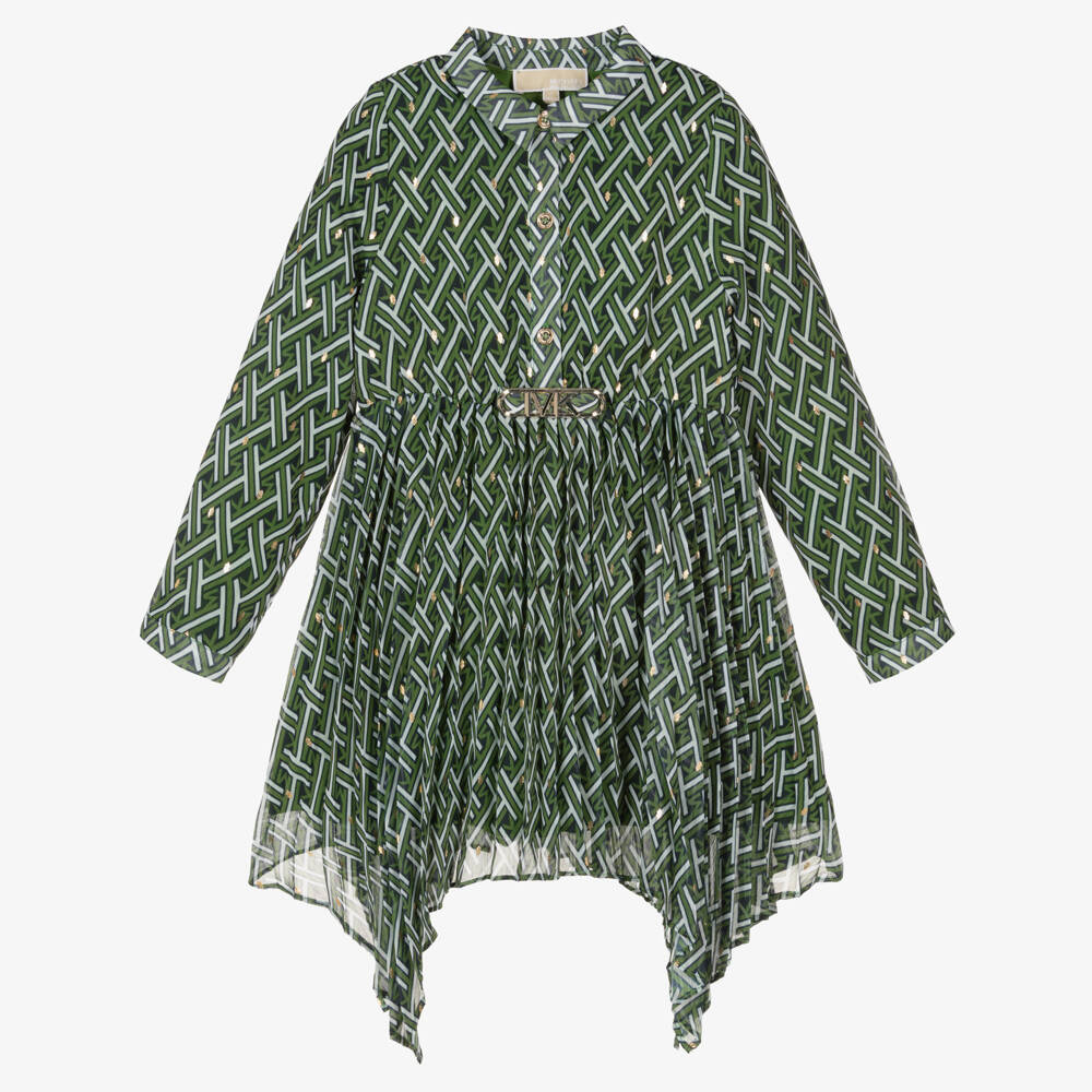 A green shirt dress for girls by Michael Kors Kids, made from lightweight and flowy chiffon. It has a black and white abstract logo pattern with glittery gold flecks and a metal MK logo plate on the front for a contemporary look. Fastening with buttons on the front, it has a stylish pleated handkerchief skirt and an elasticated back waistband. A soft viscose lining finishes the look.