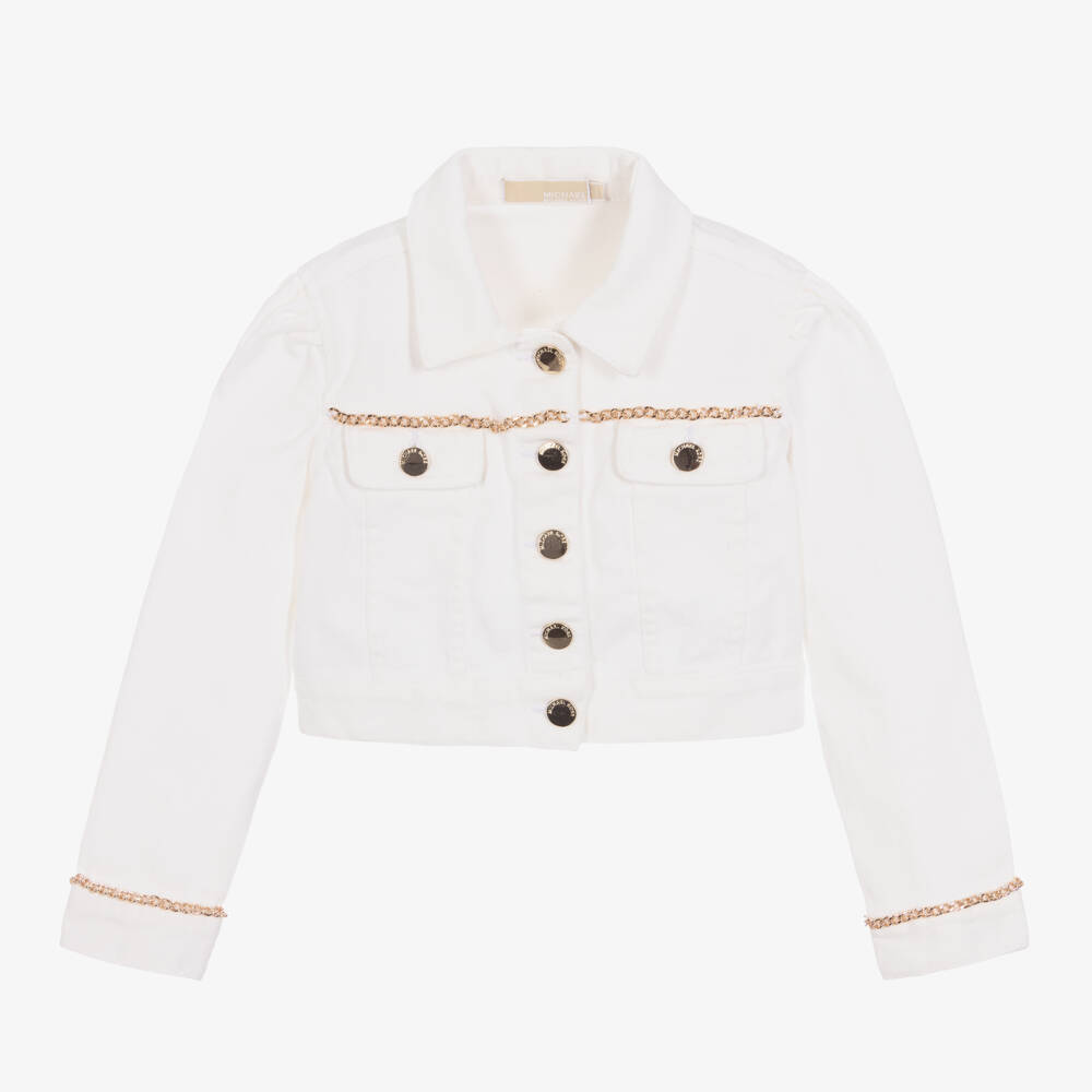 An ivory denim jacket for girls by Michael Kors, made in soft cotton with stretch for comfort. Instantly eye-catching, it has gold button fastening with pockets on the front, and metal chain trims for added edge.