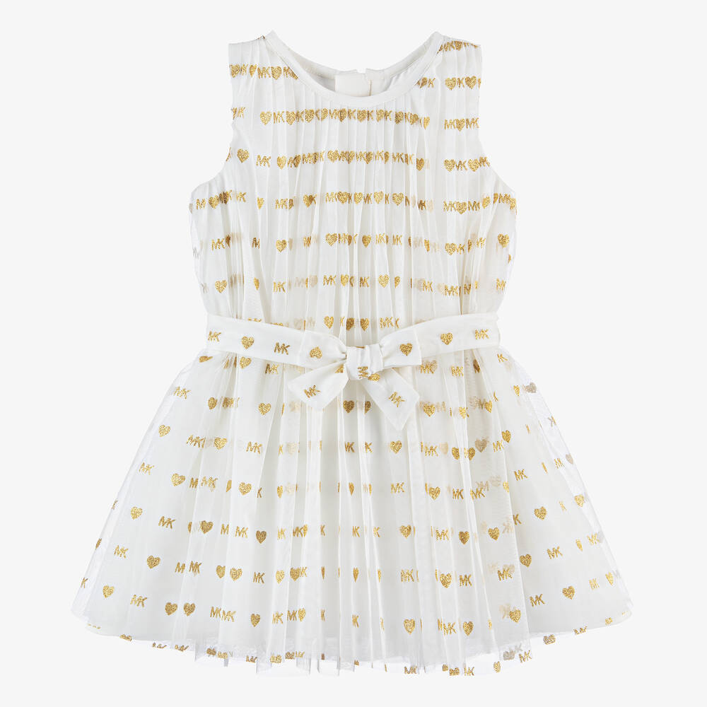 Exclusive to Childrensalon, a gorgeous ivory special occasion dress for girls by American brand Michael Kors Kids. Made in lightweight tulle, the top, pleated layer is patterned with glittery gold hearts and monograms for instant designer appeal. It can be worn with or without the detachable sash belt to create different looks and has a soft viscose lining for comfort. It fastens with a discreet, concealed zip on the back.