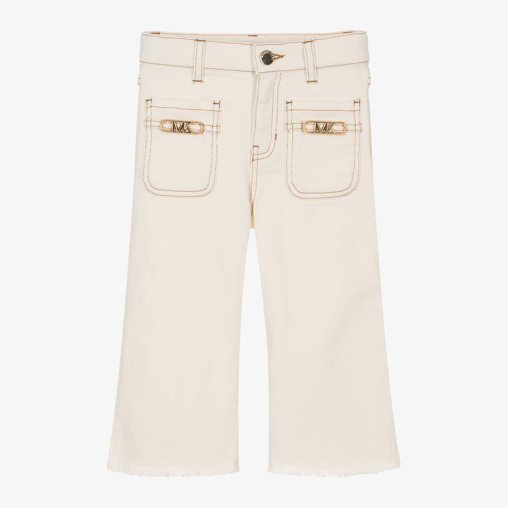 Stylish for girls, these ivory denim jeans are by American brand Michael Kors Kids. For added glamour and a distinctive look, they are trimmed with shiny gold metal Empire Signature logo hardware on the front patch pockets. Designed with wide legs and raw edged hems, they are slightly cropped and have contrast brown stitching detail. They have a comfortable adjustable waist and fasten with a zip and a gold tone logo-embossed button for an extra designer touch.