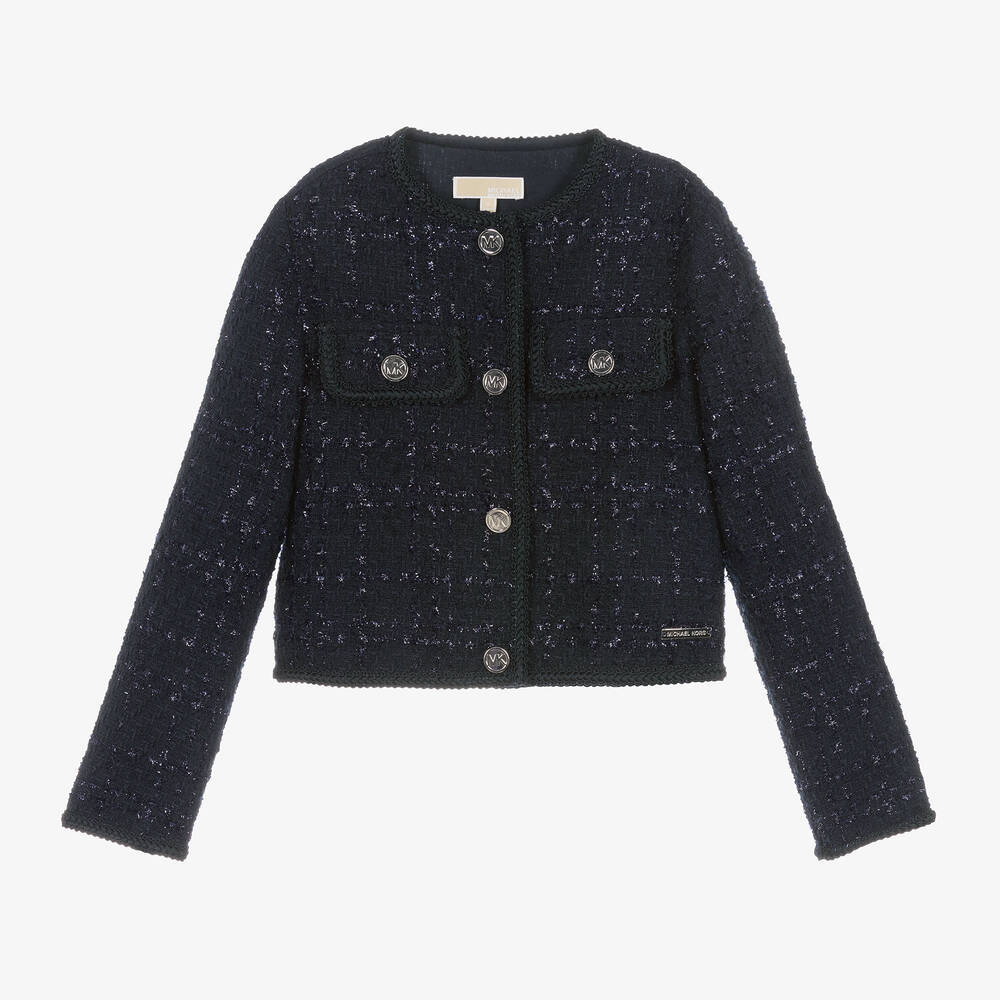 Super chic, this navy blue long-sleeved jacket for girls is by Michael Kors Kids. It is made from soft tweed woven with tinsel threads and has braided trims for a stylish finish. Fastening with silver logo buttons on the front, there are matching button embellishments on the faux flap chest pockets. It is comfortably lined in lightweight viscose twill and has a silver branded charm stitched on the hemline for a signature finish.