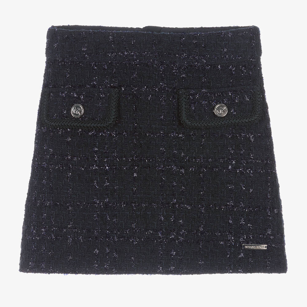 A navy blue skirt for girls by Michael Kors Kids, made from soft tweed woven with sparkly tinsel threads. Super stylish, it has faux flap pockets on the front with silver logo button embellishments and tonal braided trims. Stitched with a branded silver charm on the hemline, it fastens with an exposed zip on the back and has a lightweight viscose lining for added comfort.