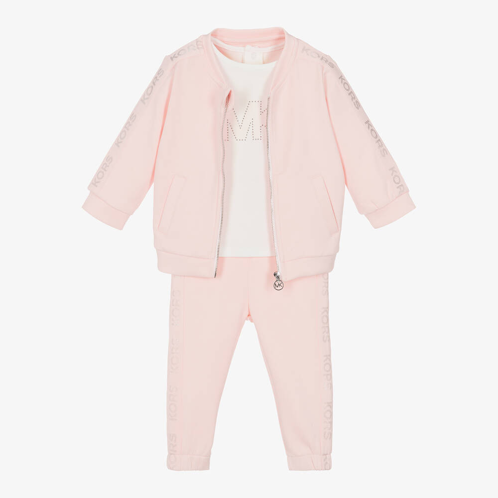 A lovely pink tracksuit set for younger girls by Michael Kors Kids, made from soft and comfortable jersey. Fastening with a branded silver zip, the tracksuit top has pockets on the front and lightly ribbed trims, whilst the matching cuffed joggers have a gently elasticated waistband. Both pieces are detailed with sparkling silver logos for a signature look. The T-shirt has the iconic MK monogram print on the front, edged in sparkling silver studs, with useful poppers on the back to help with dressing.
