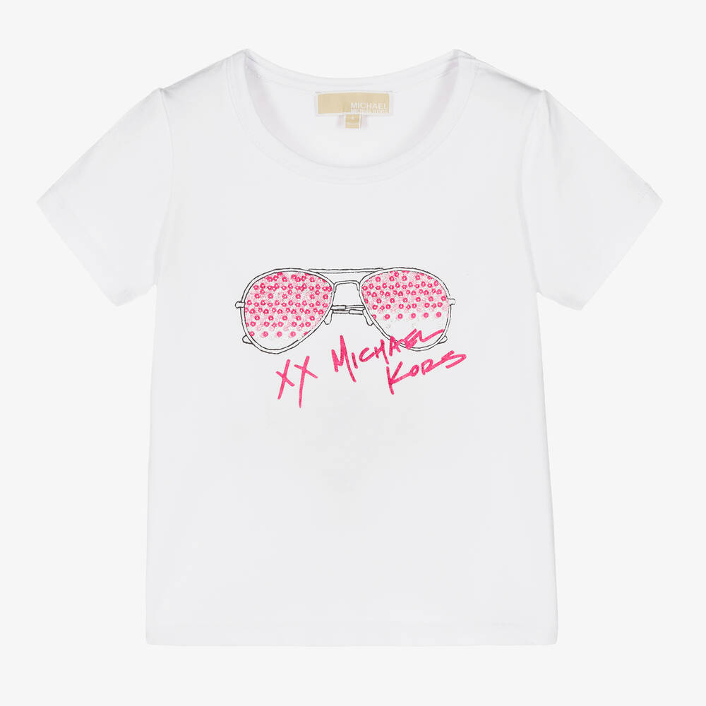 Girls white cotton T-shirt by Michael Kors, made in soft and comfortable jersey. Lightweight, it has a fun sunglasses and logo design with metallic printed sequins in shades of pink and silver.