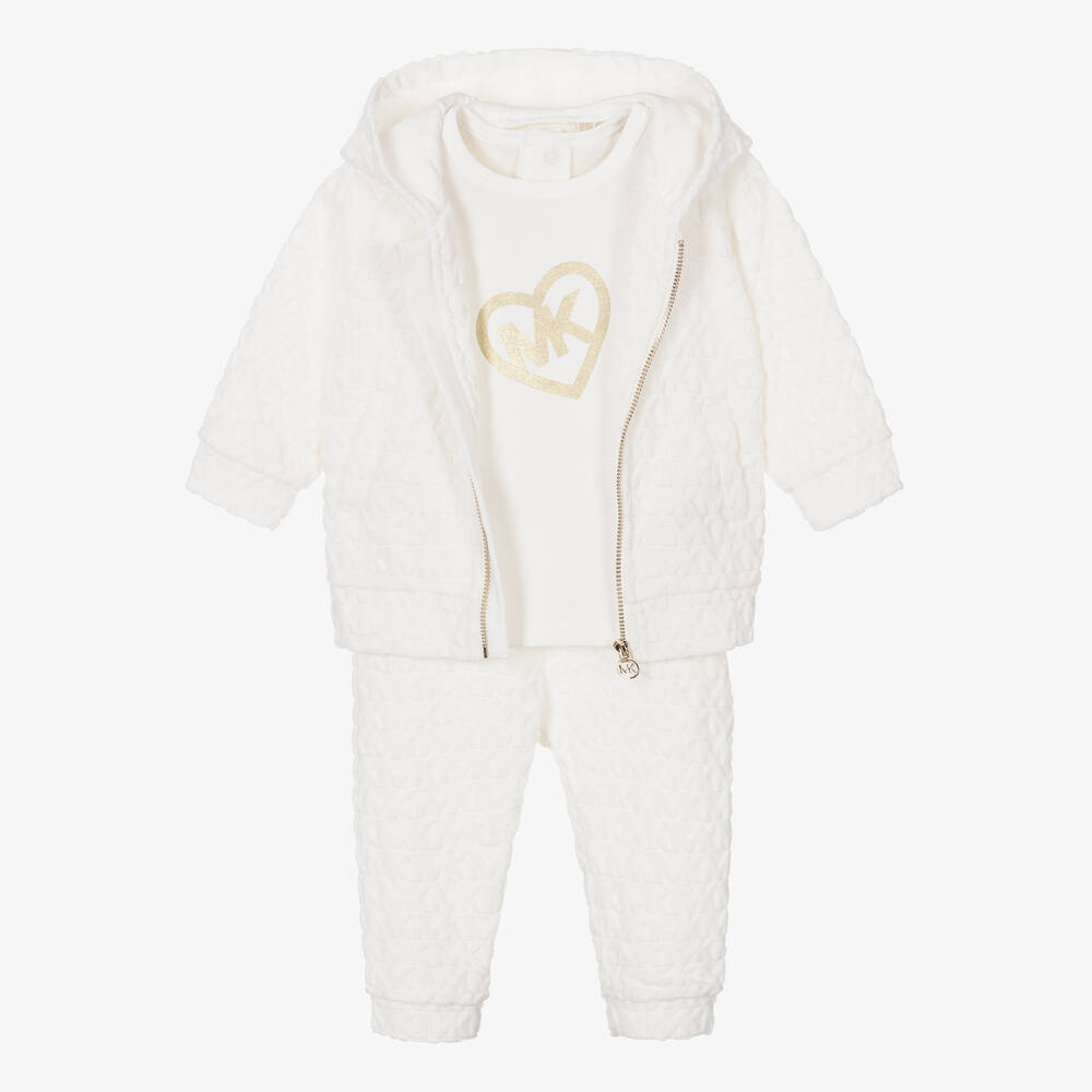 A tracksuit and top set for younger girls from Michael Kors Kids, made a soft organic cotton blend. The white hoodie and joggers are decorated with raised velour monogram branding for that signature Michael Kors look the American brand is known for. For dressing made simple, the hooded top has a gold-tone logo zip and the joggers have a comfortably elasticated waist. Completing the set is the white top, with its cute gold heart-shaped logo print and easy-fastening poppers on the back.
