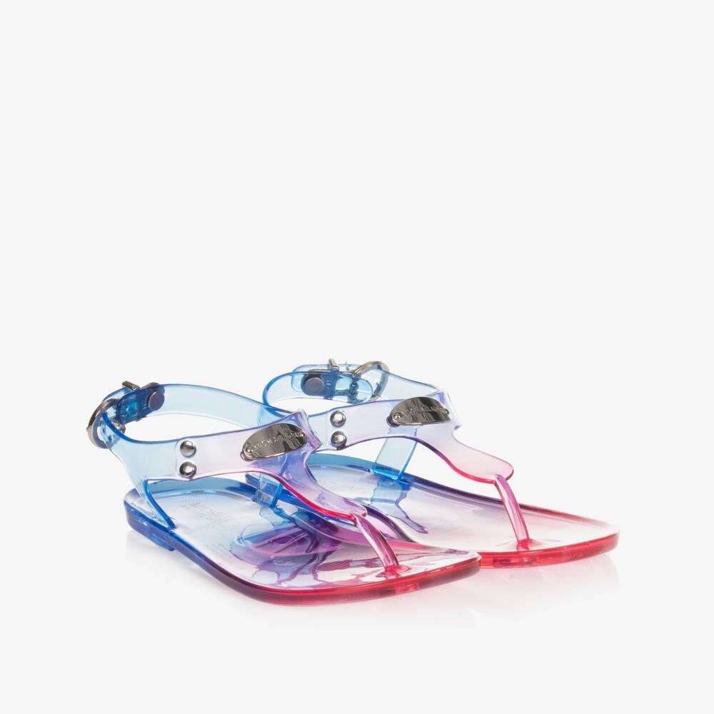 Girls lightweight and flexible translucent jelly sandals in pink, purple and blue ombre by Michael Kors. They have a silver metal logo plate, studs and adjustable, round silver metal buckle fastening on the ankle straps.