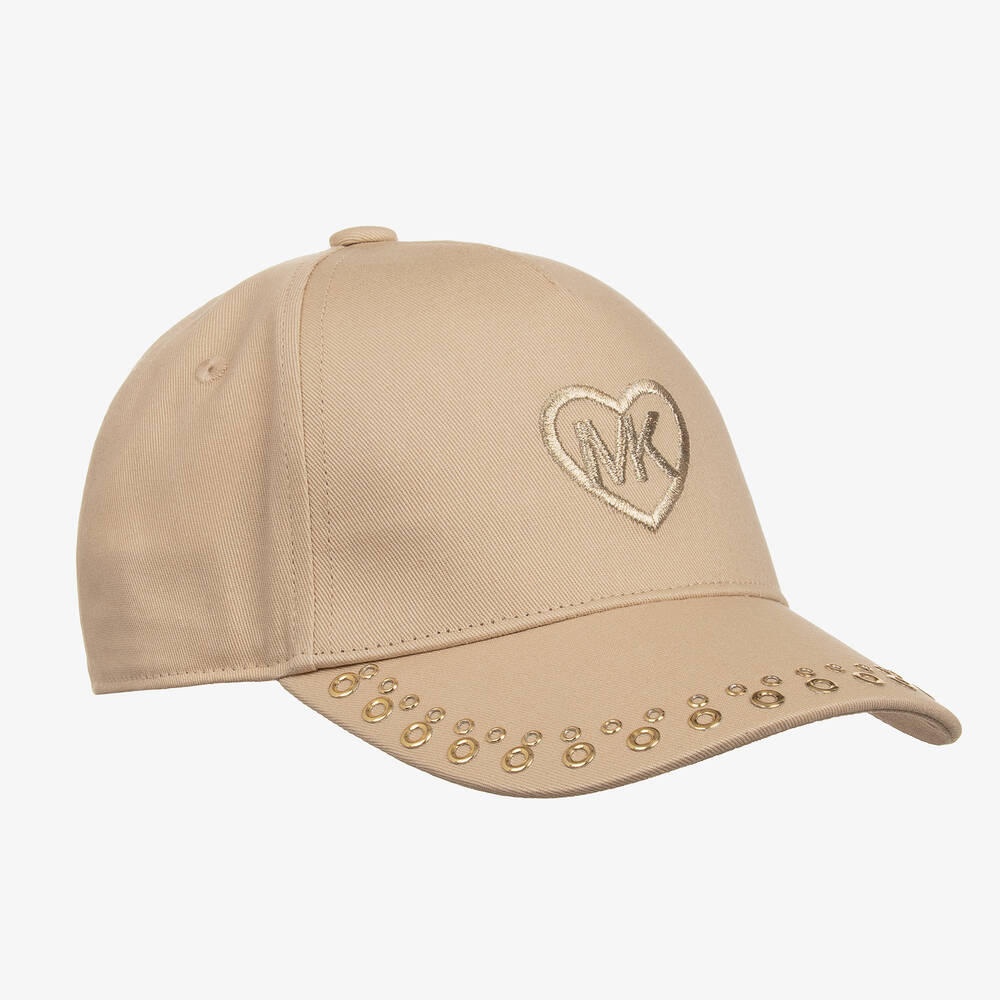 Beige cap for teen girls by Michael Kors Kids. Renowned for their chic designs, the American brand has styled this accessory with the MK logo and heart embroidered on the front and golden eyelets on the peak. It is made from soft cotton twill, with a silky part-lining and adjustable velcro back strap.