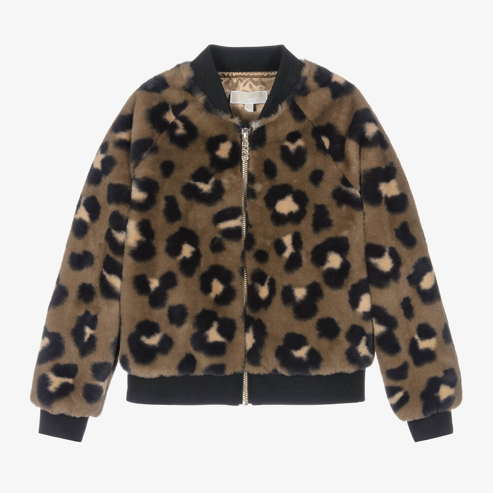 Beige faux fur bomber jacket for teen girls by Michael Kors Kids, with a black and beige leopard pattern. Beautifully soft, it has a luxurious gold satin lining, black ribbed trim and useful concealed side pockets. It fastens with a gold zip and branded pull on the front and for a cool designer finish, the concealed placket has a shiny gold logo print which is revealed when the jacket is open.