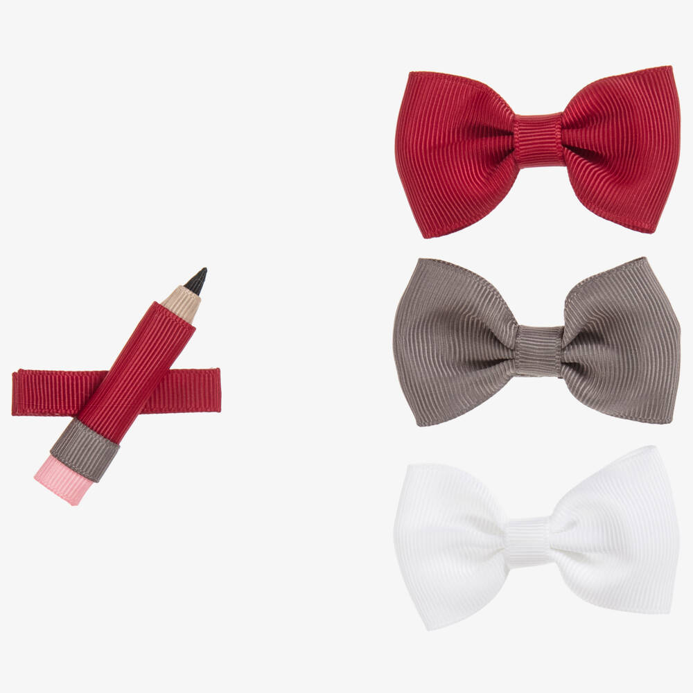 Girls pack of four hair clips from Milledeux. These pretty bow and pencil clips come in red, grey, white and pink. They have metal slide clips on the back to secure to the head.