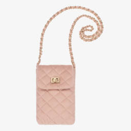 This peach pink phone bag for girls by Milledeux is a stylish accessory for carrying both a phone and other small essentials. Made in soft velvet, it has a quilted design with a flap closure, a soft poplin lining and a gold-tone, twist lock fastening for security. The gold-tone chain strap is woven with velvet for a luxurious finish.