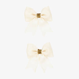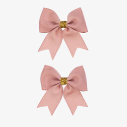 Pack of two, beautiful pink bow hair clips for girls by Milledeux, made using grosgrain ribbon with glittery gold centres for a touch of sparkle. The bows are set on ribbon-covered, nickel-free metal clips.