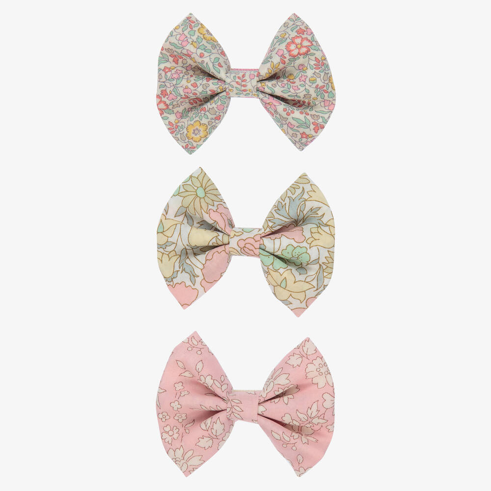 Girls pack of three bow hairclips by Milledeux, in pink and green florals. Set on a nickel-free metal clip, each bow is made in silky-feel fabric with a different Liberty print. The hairstylist-grade alligator clips have no teeth but are strong enough to stay put in thin or short hair.