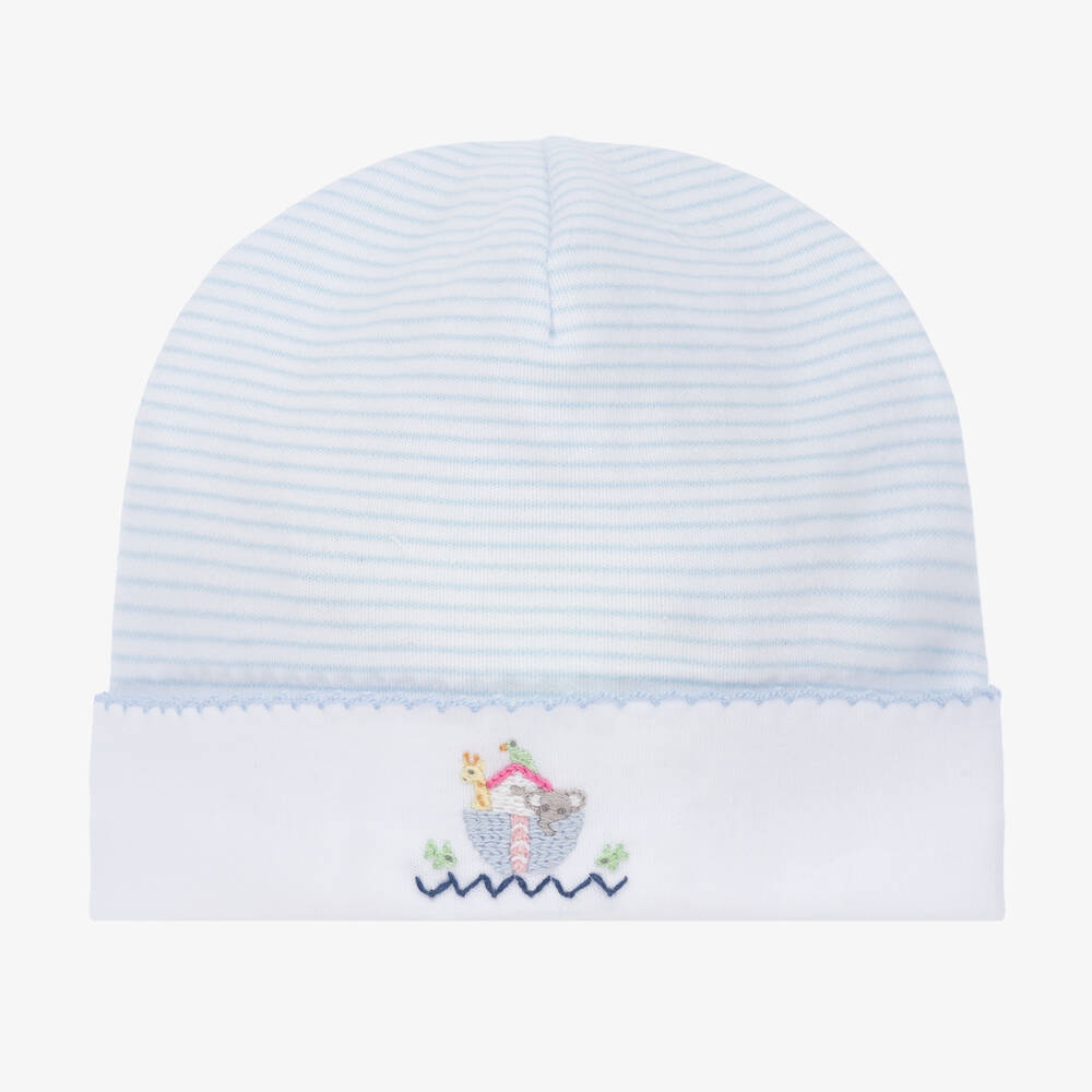 Pale blue and white striped hat for baby boys and girls by Mini-La-Mode. Handmade in the softest Pima cotton jersey that is gentle against delicate skin, it has a white brim with a beautiful hand-embroidered Noah's Ark motif on the front.