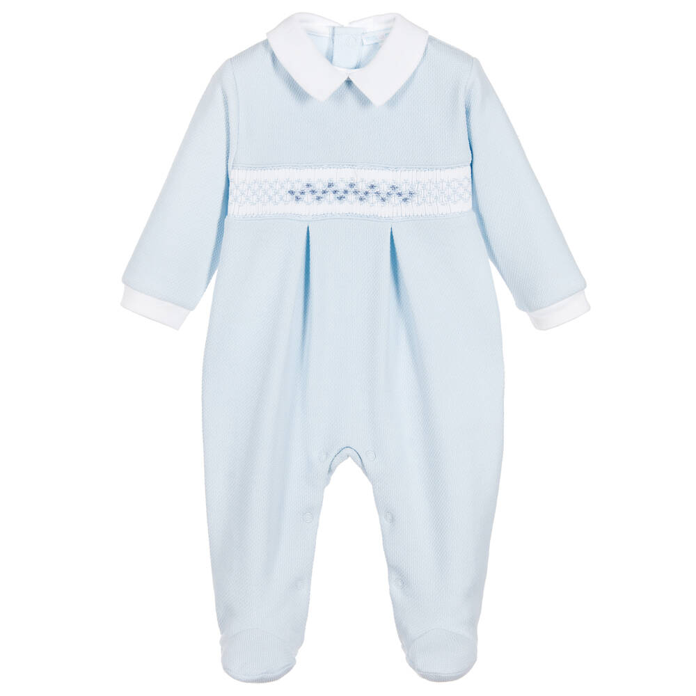 Mini-La-Mode baby boys classic hand-smocked, pale blue babygrow. Made from soft thick Pima cotton, it is perfect for added warmth in colder months. It has popper fastenings on the back and between the legs.