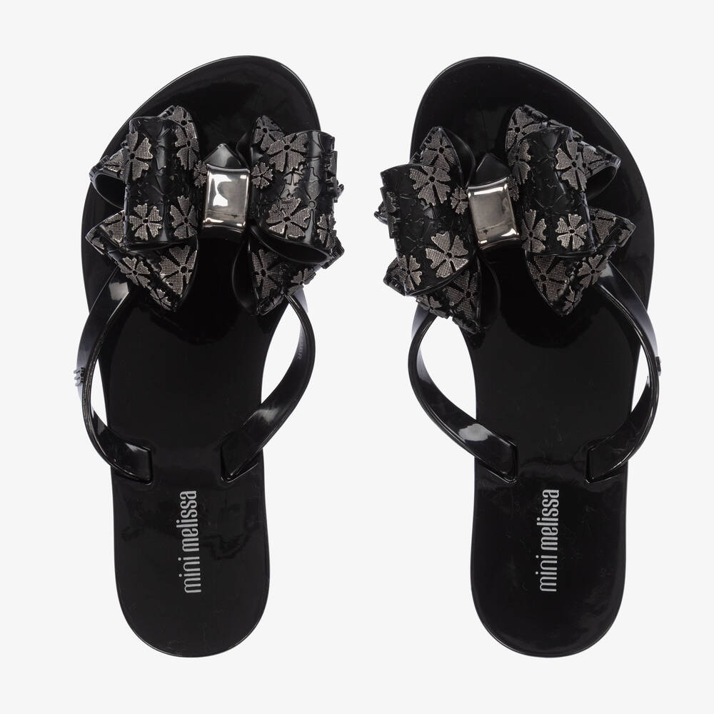 Stylish black jelly flip flops for girls by Mini Melissa. A gorgeous black and gold bow detail, patterned with flowers, elevates this casual style. They are made in the brand's distinctive sweet-scented Melflex, a recyclable PVC that is both flexible and comfortable. There is a silver logo print on the inner sole and the outer sole is ridged for improved grip.