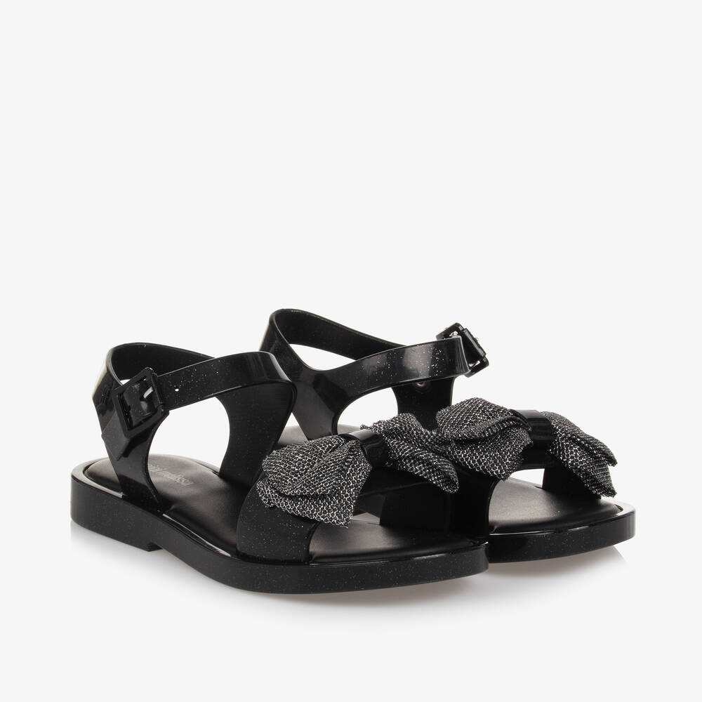 Girls Black Glitter Bow Jelly Sandals