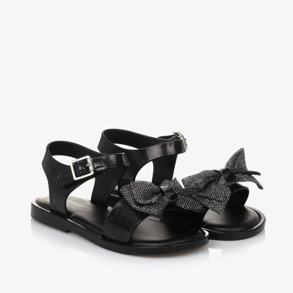 Gorgeous black jelly sandals for younger girls by Mini Melissa, made in the brand's distinctive, sweet-scented and flexible Melflex, recyclable PVC. Adding a pretty touch they are trimmed with bows, in black and sparkly silver fabric. The ankle strap is detailed with a faux buckle and fastens easily with velcro. The branded insole is softly cushioned for comfort and the outer sole is ridged for improved grip.