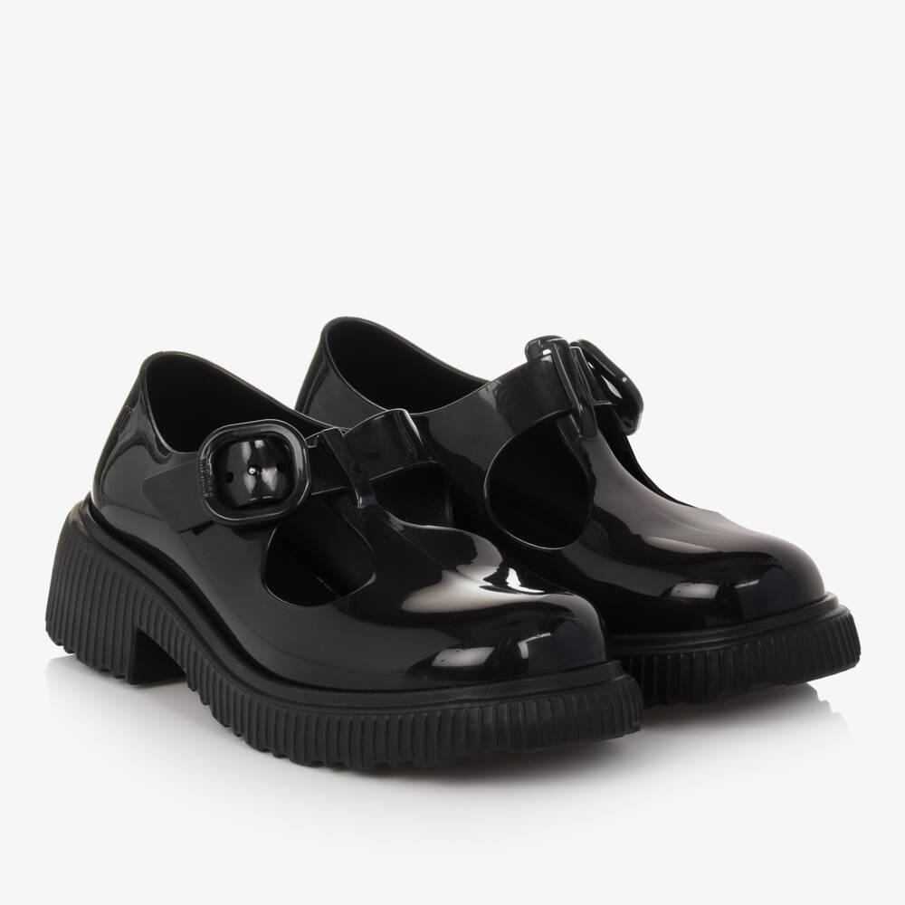 Charming black T-bar shoes for girls by Mini Melissa, with a cute buckle fastening on the front. Made from flexible sweet-scented rubber, they have a chunky moulded sole for good grip and a padded insole for extra comfort. On the heel is a small embossed logo for a subtle branded finish.