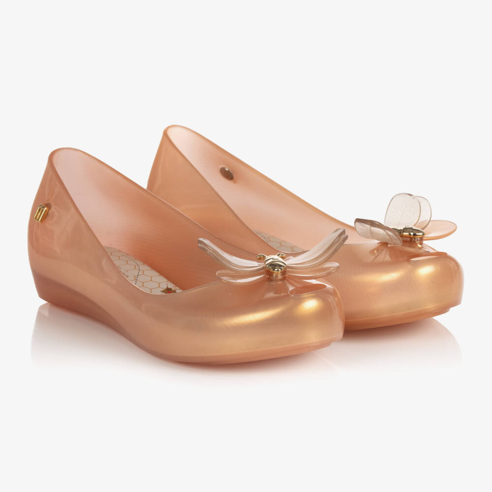Gold jelly shoes for girls by Mini Melissa, made in sweet-scented, soft and durable Melflex® PVC. These stylish peep-toe ballerina pumps have a hidden wedge heel and softly padded insoles, with a glitter bug motif.