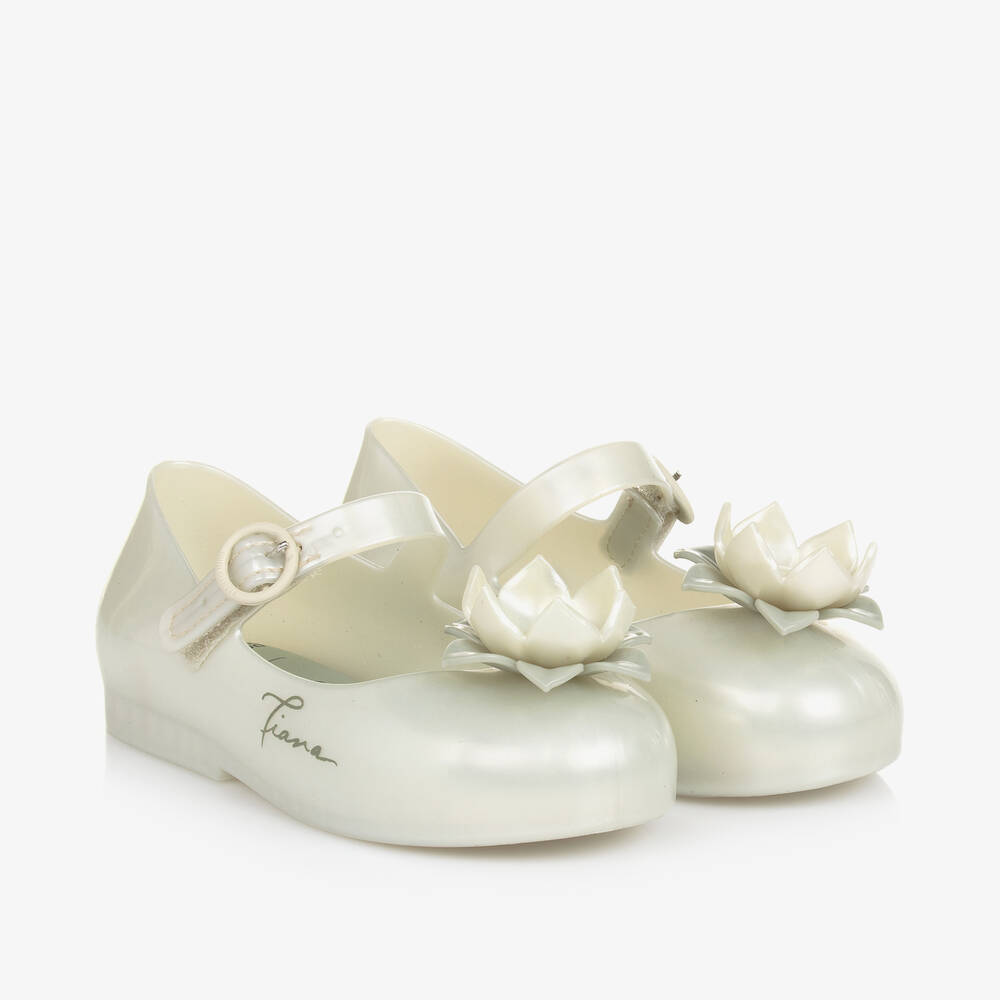 In pale ivory-green, these jelly shoes for girls by Mini Melissa have a lovely sheen with a subtle glittery sparkle. Inspired by Disney's Princess and the Frog, these pretty shoes have a 3D water lily decoration on the toe and 'Tiana' signed on one side. They fasten with an easy-to-use velcro strap, detailed with a faux buckle. For comfort, they have a lightly cushioned insole featuring a gorgeous print of Princess Tiana and a flexible, non-slip rubber outer sole.