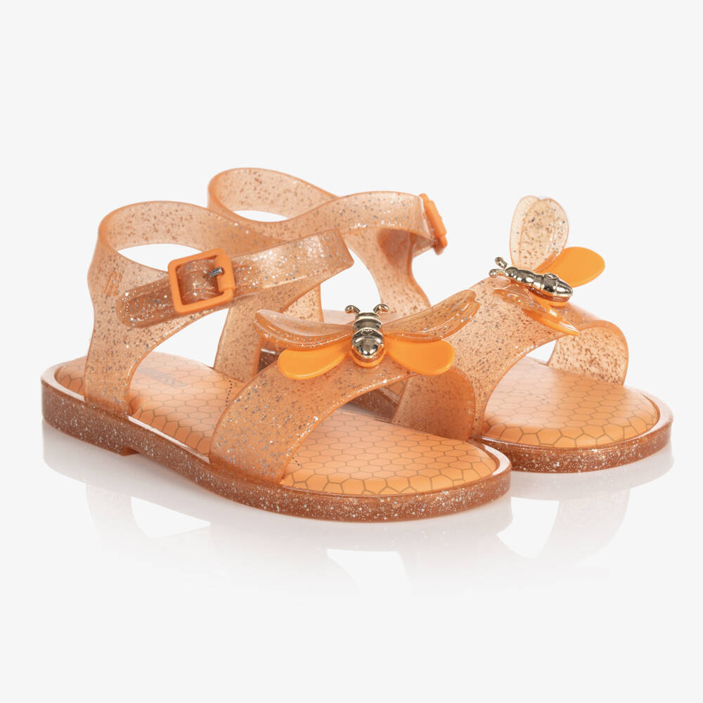 Orange glitter sandals for girls by Mini Melissa. They are made in sweet-scented Melflex® PVC, with a sparkly bug decoration across the toes. Super comfortable and flexible, these buckle-fastening sandals have softly padded insoles and a small heel. There is a non-slip rubber sole for a sure grip.