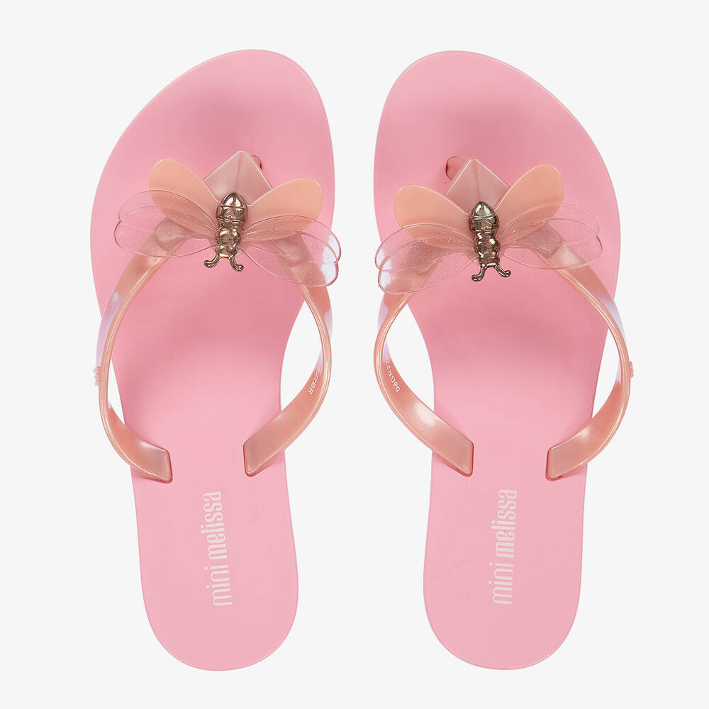 Girls pink flip-flops by Mini Melissa, made in sweet-scented, and durable Melflex® PVC. They have soft foot straps and toe post, decorated with a sparkly silver bug motif.