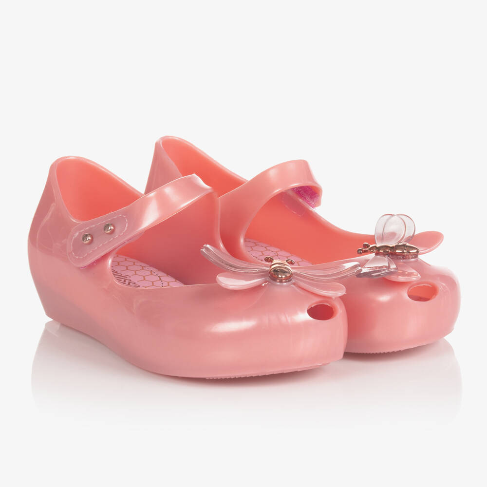 Pink jelly shoes for girls by Mini Melissa, made in sweet-scented, soft and durable Melflex® PVC. These stylish peep-toe shoes have softly padded insoles and non-slip pads on the outer soles. They have a large bug motif with a shiny rose gold centre and a velcro fastening strap with rose gold stud detailing.