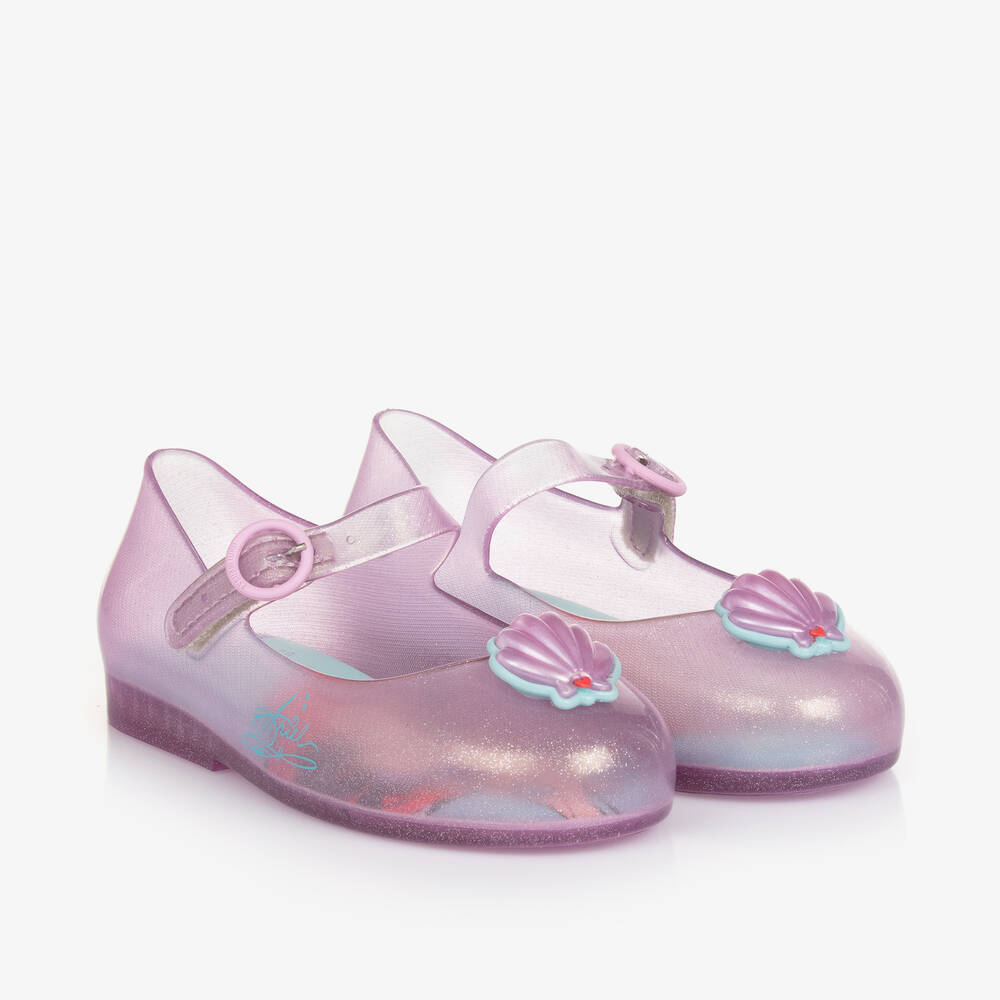 In lilac pink, these jelly shoes for girls by Mini Melissa have a lovely sheen with a glittery sparkle. Inspired by Disney's The Little Mermaid, these pretty shoes have a clam sea shell decoration on the toe and 'Ariel' signed on one side. They fasten with an easy-to-use velcro strap, detailed with a faux buckle. For comfort, they have a lightly cushioned insole featuring a gorgeous print of Princess Ariel and a flexible, non-slip rubber outer sole.