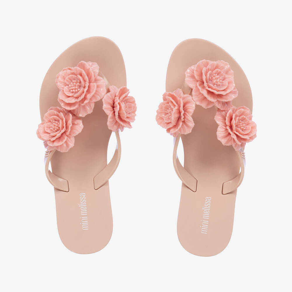 Gorgeous pink flip flops for girls by Mini Melissa. Accented with pretty flowers on the straps, these slip-on, rubber shoes have a rubberised, ridged outer sole for improved grip.