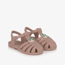 Pink jelly pumps for girls by Mini Melissa, offering a delightful blend of style and comfort. Made in the brand's signature sweet-scented Melflex rubber, they feature a glossy finish with a charming metallic rose gold bow on the front. They fasten with a velcro strap across the foot, detailed with a faux buckle and have a comfortable, lightly cushioned insole and flexible, non-slip rubber outer sole.