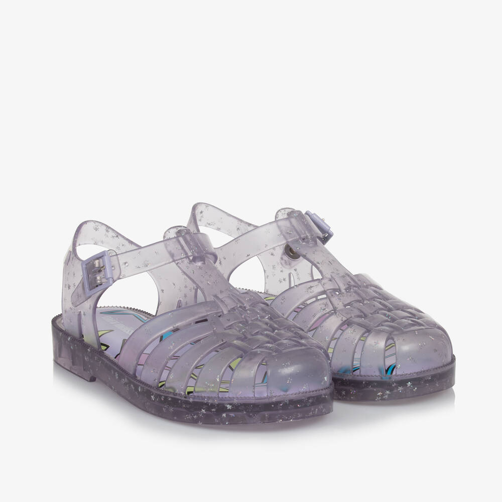 Pretty lilac purple jelly sandals for girls by Mini Melissa, flecked with little glittery stars. Made from the brand's signature sweet-scented Melflex rubber, the flexible uppers are designed with a closed-toe. They fasten with an adjustable buckle and have a branded, cushioned insole for comfort. The outer sole is studded providing good grip on slippery surfaces.