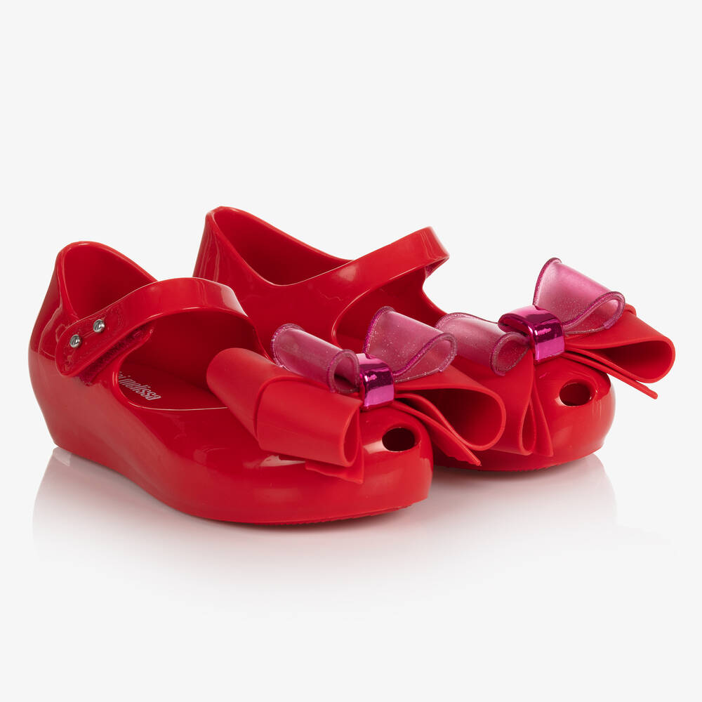 Red jelly shoes for girls by Mini Melissa, made in sweet-scented, soft and durable Melflex® PVC. These stylish peep-toe shoes have a hidden wedge heel, softly padded insoles and non-slip pads on the soles. They have a large bow on the front, with a glittery pink bow and pink metallic centre. The velcro fastening strap is trimmed with silver stud detailing.