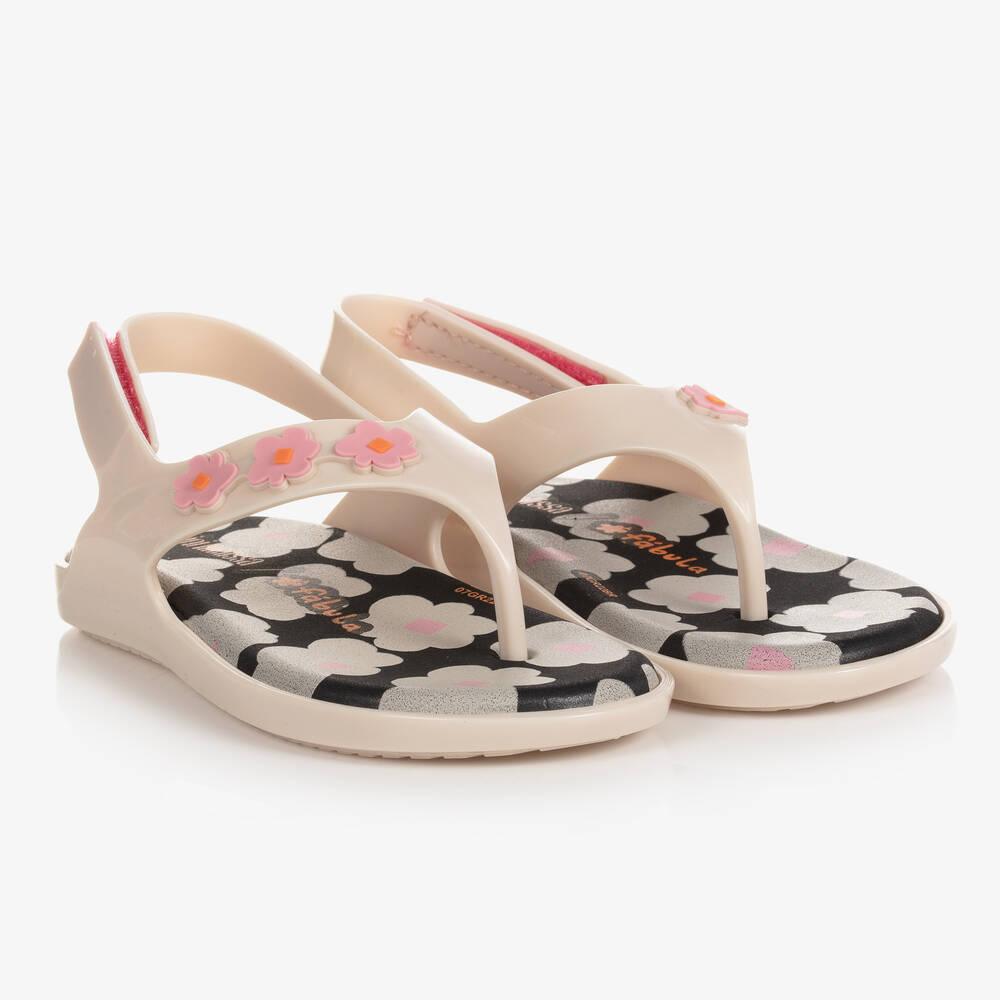 White jelly sandals for girls by Mini Melissa, made in sweet-scented, soft and durable Melflex® PVC. They have a toe post and a floral lined softly padded insole, with non-slip outer soles and velcro closing side strap.