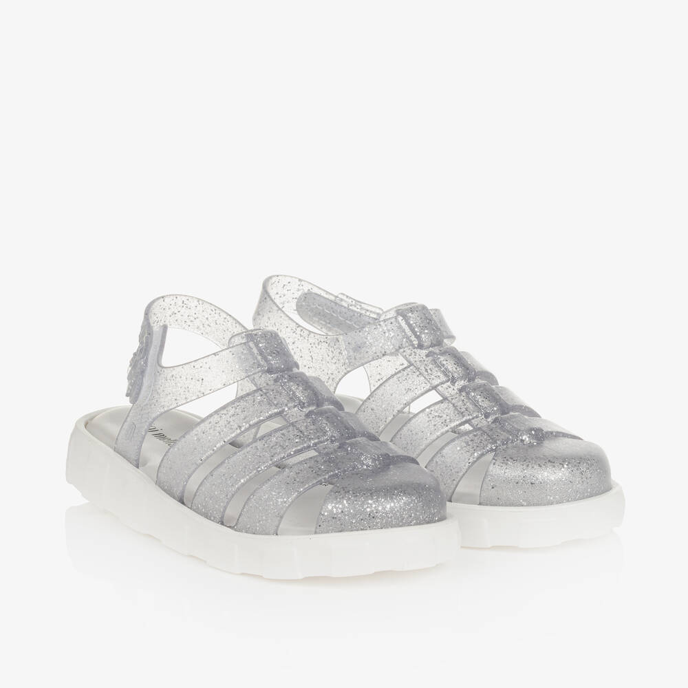 Pretty white jelly sandals for little girls by Mini Melissa. The uppers are made from the brand's signature sweet-scented Melflex rubber, with flecks of silver glitter for a girly look. Fastening easily with a velcro strap, they have a cushioned insole for comfort, with a stylish chunky outer sole.