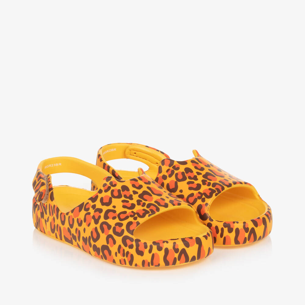 Yellow sandals for little girls by Mini Melissa, made in the brand's signature sweet-scented rubber. These fun shoes have a stylish leopard print and a velcro fastening strap around the back. The inner soles are moulded for a comfortable fit and they have non-slip outer soles.